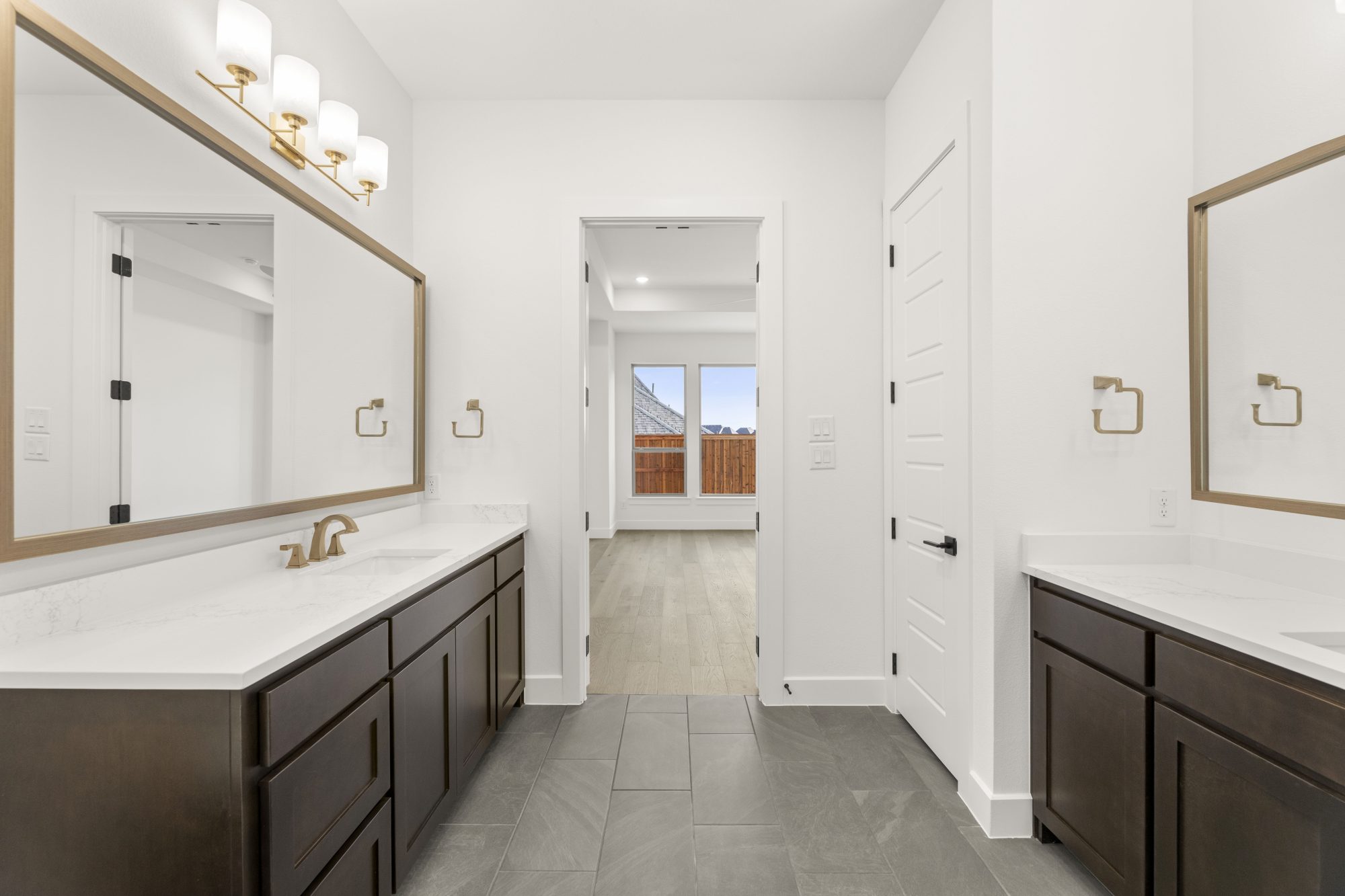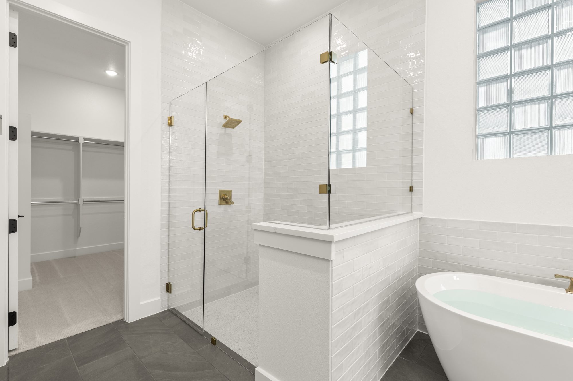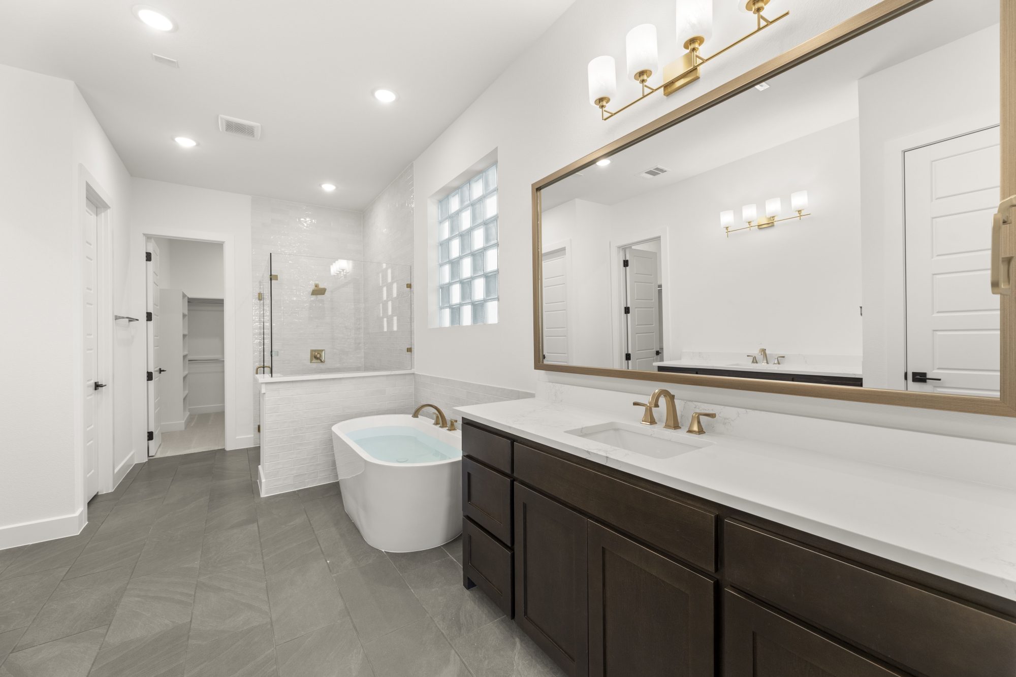separate vanities, a relaxing soaking tub and a spacious closet that leads to the laundry room.