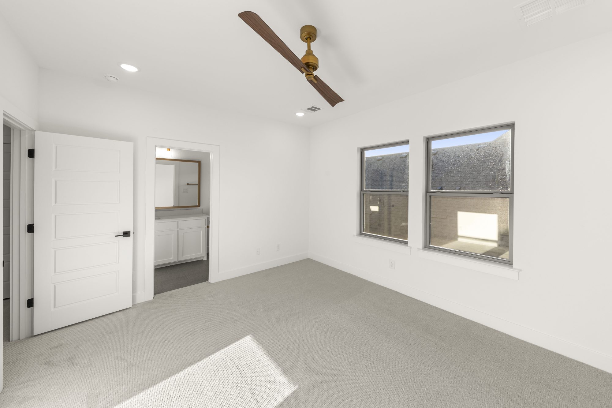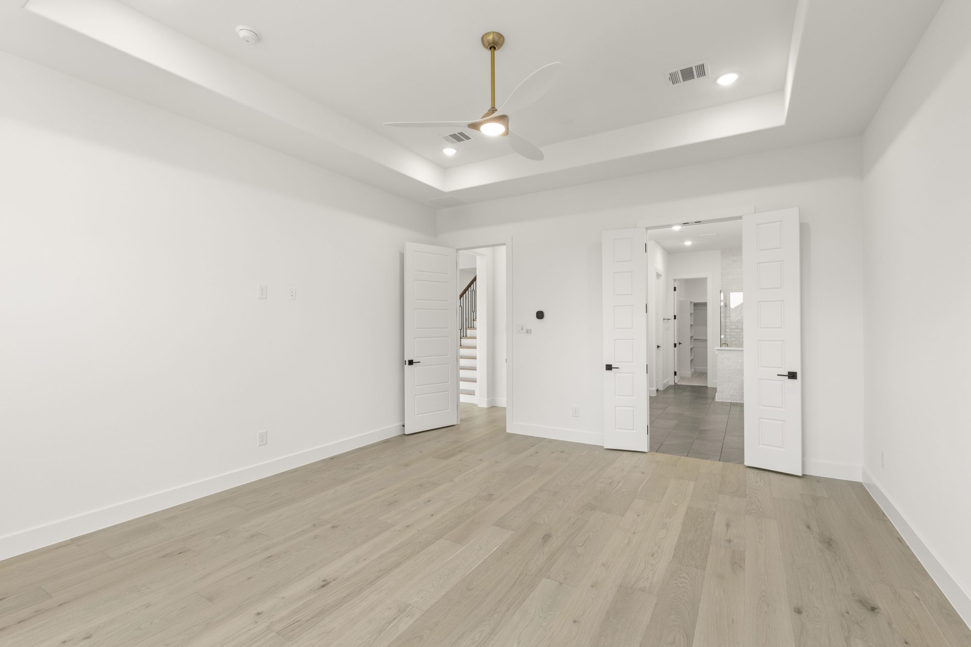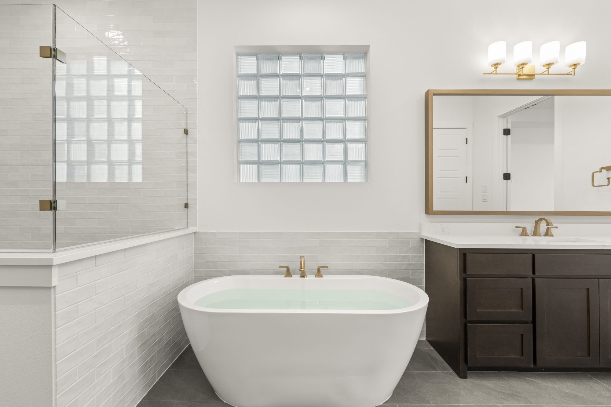separate vanities, a relaxing soaking tub and a spacious closet that leads to the laundry room.